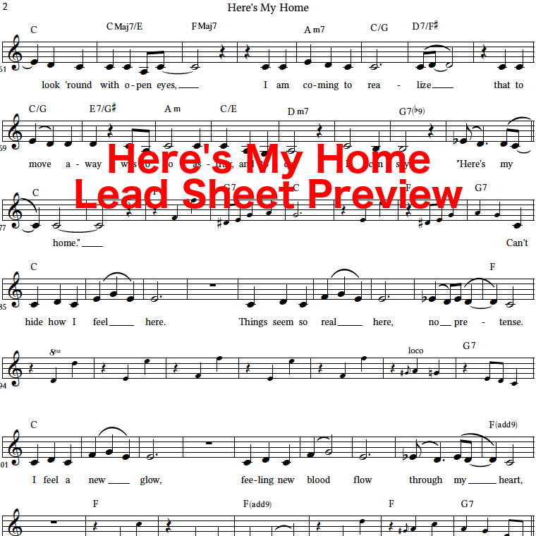 Along with the purchase of the limited edition CD, you'll also receive mp3s of the entire album (now with the solo piano version of Sloan's theme included), a high-res jpg of the album artwork, and lead sheets of Here's My Home and I Won't Let You Go This Time in both PDF and printed formats. Samples of the lead sheets can be viewed in the media slider above.